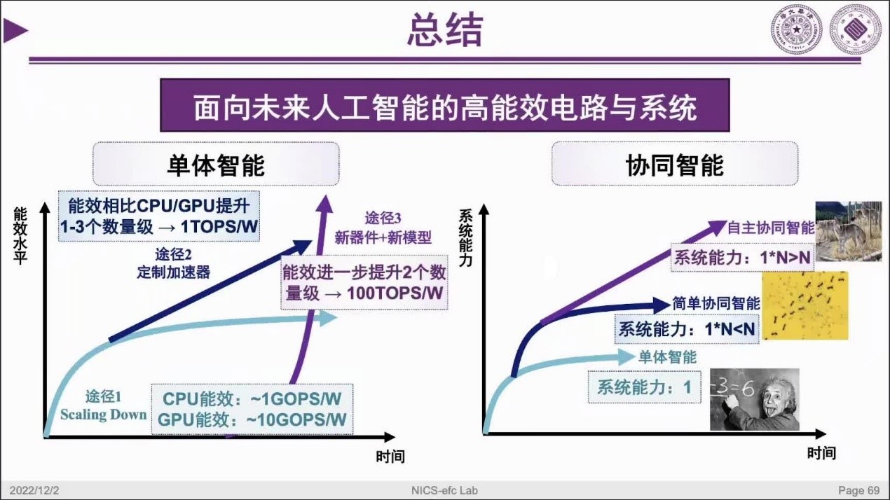 首先,汪教授介绍了人工智能的发展历程,指出当今人工智能正在从感知智能向认知智能转变,并面临着能量供不应求和亟需高性能大规模芯片的应用难题。基于此,汪教授提出了利用软硬件协同优化提升计算效能的研究目标及方法。